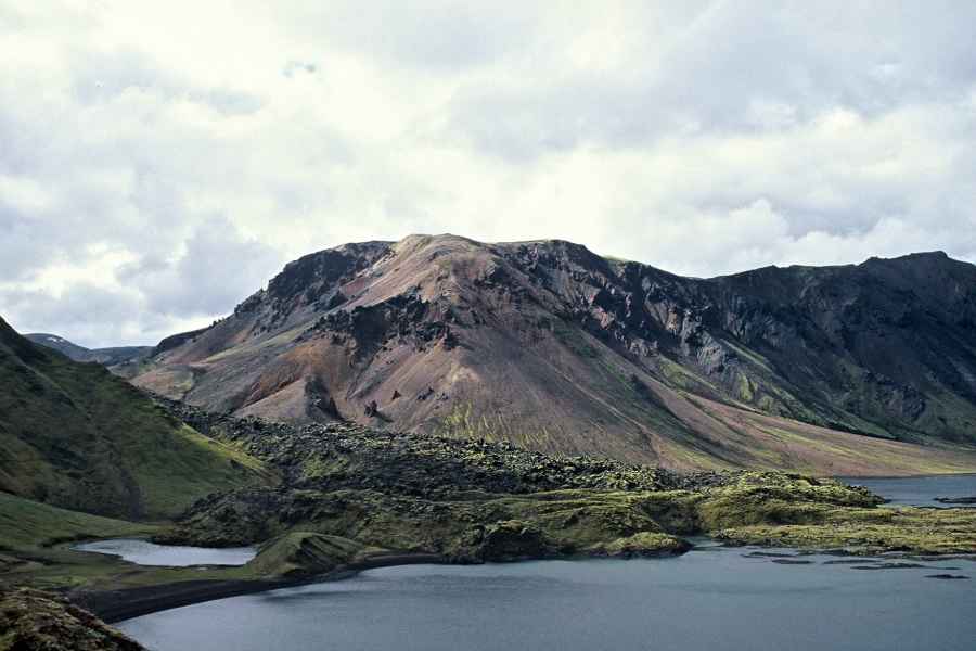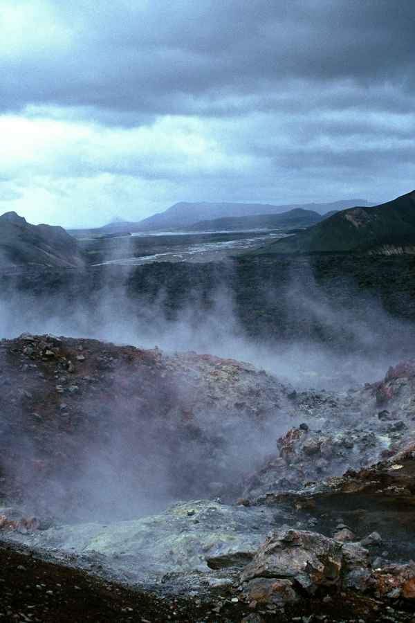Our next destination was Landmanalaugur. The bus arrived there in the early afternoon. It was cold and windy. The large number of tents immediately put me off staying there overnight. Torn between the thought of bathing in the hot springs and the prospect of the first stage of the Laugavegur, we decided to carry straight on. The first sulphurous thermal area was very impressive. Everywhere, it was boiling and bubbling. Small hot streams gushed out of the earth and the mud glittered in iridescent colours.