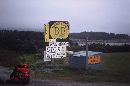 Auf den ersten beiden Etappen war unglaublich oft das Blasen der Wale zu hören. Und als wir wieder einmal nach ihnen Ausschau hielten war das Wasser von lauter schwarzen Rücken bevölkert, eine Delfinschule! Dabei dachten wir, dass es so weit im Norden gar keine Delfine gäbe. Im Supermarkt von Mobile hat Reinhold ein B&B für uns organisiert. Am Trailende in Tors Cove begann die Suche nach dem Pond View B&B. Das sind noch 2-3 km bis zum Highway 10, sagte uns ein Einheimischer (übrigens: bergauf). Endlich am Highway angekommen, konnte ich mich nicht mehr erinnern ob er gesagt hatte: nach rechts, oder nach links und dann auf der rechten Seite. Wir entschieden uns, nach rechts abzubiegen. Einen Kilometer weiter beschlossen, wir noch einmal nach dem Weg zu fragen. Gerade als die vernichtende Nachricht, dass es 3 km in die andere Richtung sind, über den Zaun flog, hielt abrupt ein Geländewagen. Der Supermarktbesitzer aus Mobile hatte sich auf die Suche nach uns gemacht weil wir nicht zum vereinbarten Zeitpunkt im B&B waren. Er packte uns und unsere Rucksäcke ein und brachte uns hin!