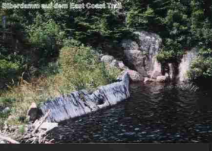 Nachts regnete es und es dauerte lange, bis es am nächsten Morgen aufklarte. Doch dann konnten wir endlich starten. Ein Taxi brachte uns zum Startpunkt des East Coast Trails bei Fort Amherst. Doch wir konnten den Einstieg nicht finden. Also fragten wir alle, die gerade vorbeikamen. Einer wußte es: Neben der Straße steht ein Schornstein, ein Relikt, vom Haus ist nichts übriggeblieben. Der Schornstein ist weiß angemalt, mit einem schwarzen Mann mit Paddel drauf. Von dort führt ein Pfad den Hang hinauf. Der Weg steigt steil durch einen Felssturz nach oben, vorbei an den Überresten einer Zisterne aus dem 2. Weltkrieg. Auf den ersten Kilometern kreuzen sich mehrere Wege und die Markierungen sind nicht immer eindeutig. So haben wir ein paar Mal falsche Abzweigungen erwischt und mussten wieder zurück. Jedoch sind die Beschreibungen so gut, dass man Fehler in aller Regel schnell bemerkt und korrigieren kann. Die ersten Kilometer waren ziemlich anstrengend, aber die Ausblicke über den Küstenstreifen hinab aufs offene Meer waren alle Mühen wert. Am späten Nachmittag kamen wir an einen See, der wohl von einer ganzen Biberfamilie aufgestaut wurde.